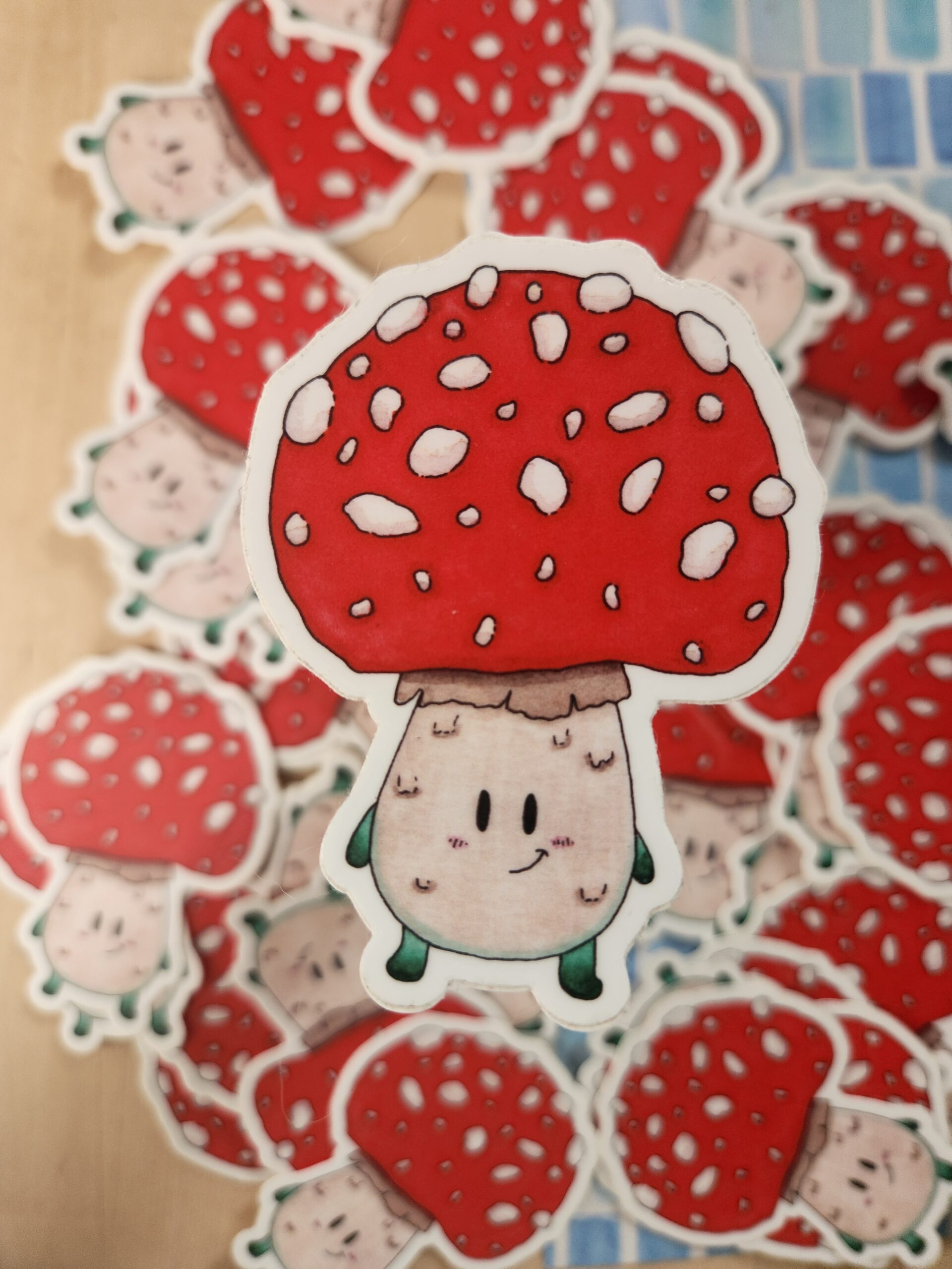 What would a world full of mushroom people look like? Well, here’s a glimpse! This is my original character design and idea. The mushroom character is based off of the real world mushroom called amanita muscaria, also known as the fly agaric or fly amanita mushroom. This sticker is based off of a larger watercolor painting I did of the character.