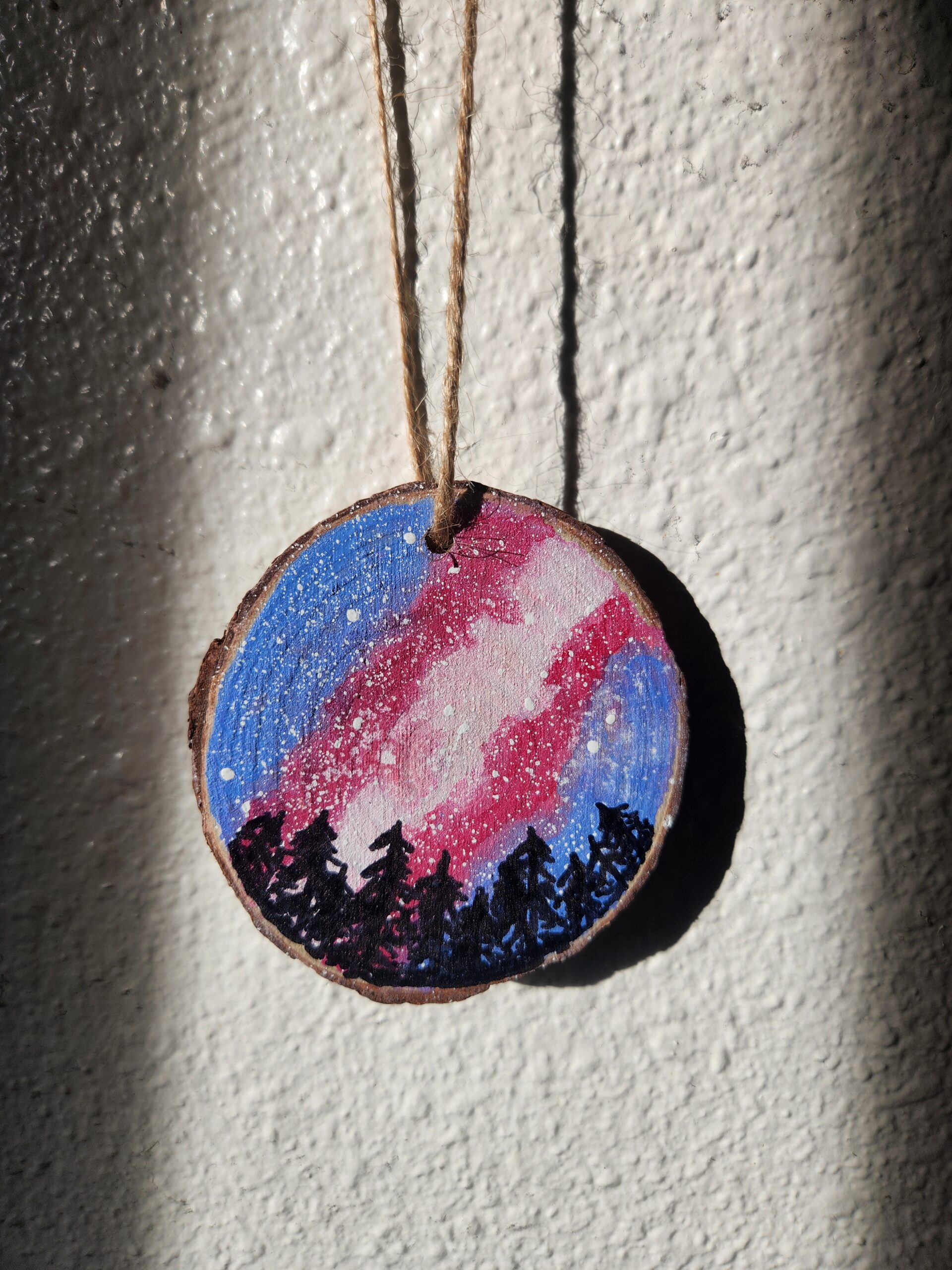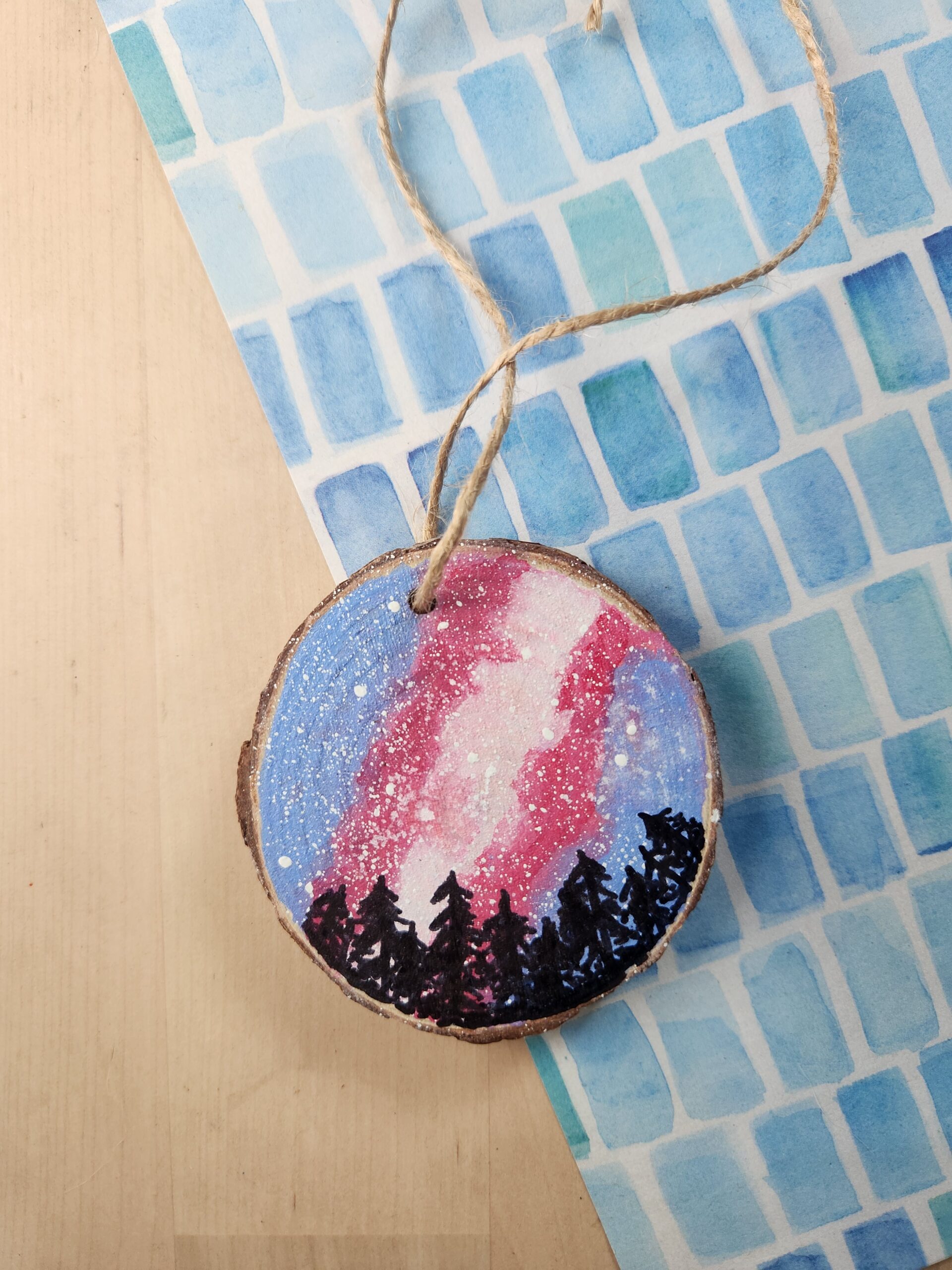 -Each wooden slice is hand painted with watercolor and then sealed with a wax varnish.